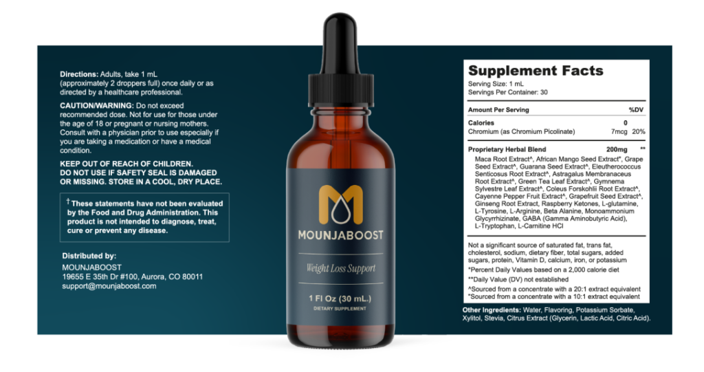 “Unlike common tablets or powders, MounjaBoost comes in an easy-to-use dropper for faster absorption and maximum effectiveness. Its formula combines 8 powerful plant-based ingredients — including maca root, African mango, green tea, guarana, Korean turmeric, cayenne pepper, raspberry ketones, and Coleus forskohlii. Together, they’re designed to:”